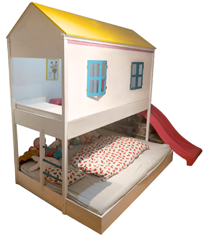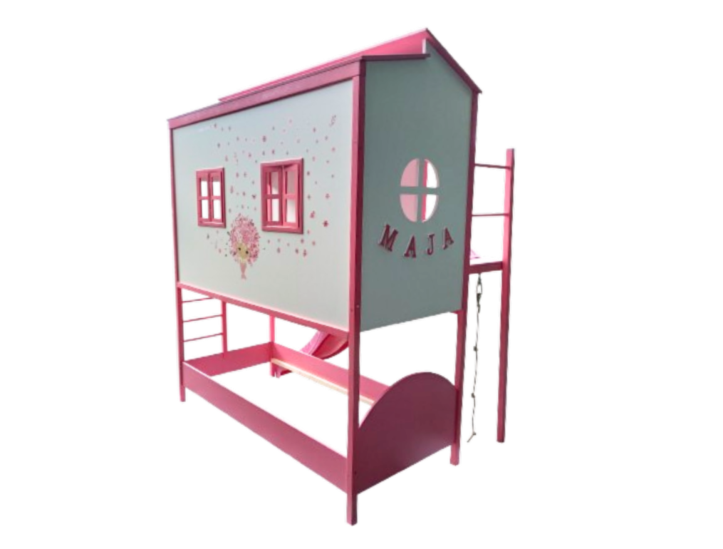 Naše hiške-postelje združujejo udoben prostor za spanje, kotiček za igro in pravljično skrivališče – vse v enem. Spodaj se nahaja udobno ležišče, zgoraj pa otroka čaka čaroben igralni kotiček, kjer se lahko igra, sanjari ali umakne v svoj svet. Za dodatno zabavo pa poskrbi tobogan, ki ga lahko namestimo na levo ali desno stran hiške. Hiška-postelja je idealna rešitev za manjše sobe, saj omogoča pameten prihranek prostora. Poleg tega ponuja neomejene možnosti za ustvarjalnost – hiško lahko po želji dekoriramo mi ali pa jo okrasite sami skupaj z vašim otrokom, kar jo naredi še bolj posebno in osebno. Vse hiške so na voljo v različnih barvah in ponujajo možnost nadgradenj,